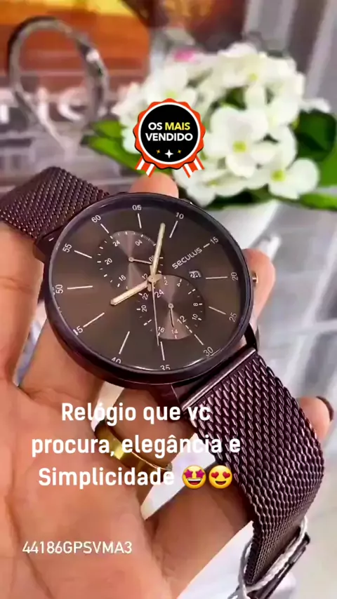 Este relógio é um modelo cronógrafo com vidro abaulado e numeração completa. Possui botões acionadores laterais na cor rosé, trazendo destaque sobre a folheação marrom. Sua pulseira é em malha de aço de fácil ajuste, ótimo para todas as ocasiões. Veste bem todos os tamanhos de pulsos. Esse relógio possui a caixa com 4,8 cm de tamanho. #viral #relogiosdeluxorelogio #relogios #seculus #relogiosmasculinos
