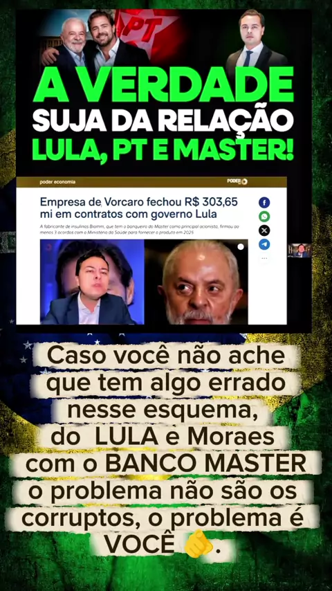 Caso vocĂȘ ache que nĂŁo tem nada errado no saco do BANCO MASTER, onde o LULA e MORAES estĂŁo envolvidos, o problema do Brasil nĂŁo sĂŁo os corruptos, o problema do Brasil Ă© VOCÊ QUE APOIA BANDIDO. #historia #noticias #democracia