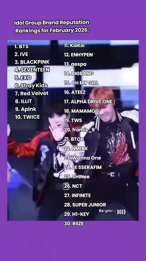 Idol Group Brand Reputation Rankings for February 2026: 1. BTS 2. IVE 3. BLACKPINK 4. SEVENTEEN 5. EXO 6. Stray Kids 7. Red Velvet 8. ILLIT 9. Apink 10. TWICE 11. KiiiKiii 12. ENHYPEN 13. aespa 14. BIGBANG 15. OH MY GIRL 16. ATEEZ 17. ALPHA DRIVE ONE 18. MAMAMOO 19. TWS 20. fromis_9 21. BTOB 22. NMIXX 23. Wanna One 24. LE SSERAFIM 25. SHINee 26. NCT 27. INFINITE 28. SUPER JUNIOR 29. H1-KEY 30. RIIZE #ot7bts #btsinfo
