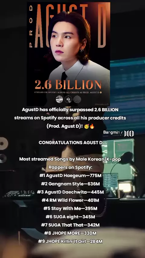 Most streamed Songs by Male Korean/K-pop Rappers on Spotify: #1 #AgustD Haegeum—775M #2 Gangnam Style—636M #3 #AgustD Daechwita—445M Wild Flower—401M Stay With Me—395M eight—345M That That—342M MORE—330M Killin' It Girl—284M has officially surpassed 2.6 BILLION streams on Spotify across all his producer credits (Prod. Agust D)! 🥳🔥 CONGRATULATIONS AGUST D