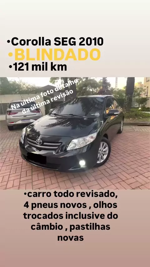 Corolla SEG 2010 automático BLINDADO 121 Mil km Última Revisão na oficina foi gasto R$ 11,500,00 incluindo troca dos 4 pneus , freio , todos óleos etc R$57.900,00 Na última foto nota do serviço é pegar e andar