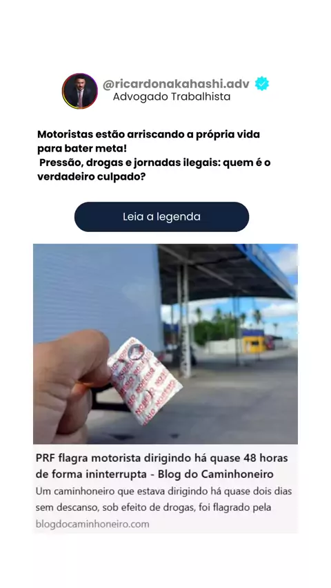 🚨 Motorista exausto e sob efeito de drogas: a responsabilidade é também do empregador! Um caminhoneiro foi flagrado dirigindo há quase dois dias sem descanso, sob efeito de drogas, colocando vidas em risco na BR-262, no Espírito Santo. Segundo ele, o motivo da imprudência? Pressão da empresa para realizar entregas rápidas, com comissão extra por produtividade. Esse caso escancara uma dura realidade nas estradas brasileiras — e sim, há implicações jurídicas sérias para o empregador.