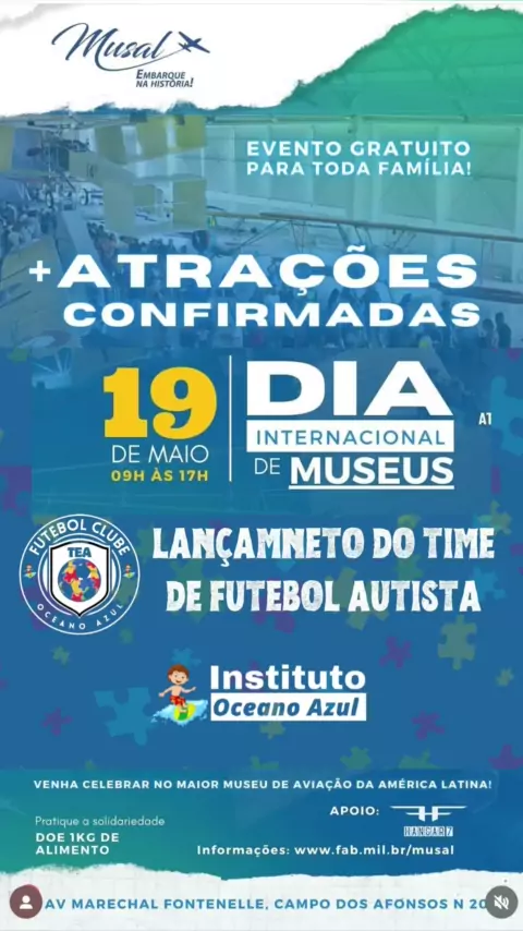 Lançamento do Primeiro Time de Futebol de Autistas no Museu Aeroespacial: #DiversidadeEmCampo ⚽️ Prepare-se para uma manhã incrível no dia 19 de maio! O Museu Aeroespacial (@museuaeroespacial) e o Hangar 7 Eventos (@hangar7eventos) se unem ao Instituto Oceano Azul para um evento histórico: o lançamento do Primeiro Time de Futebol de Autistas, Familiares e Apoiadores do Brasil! ⚽️ Será uma manhã repleta de atividades adaptadas para toda a família, com a participação do Instituto Oceano Azul e a