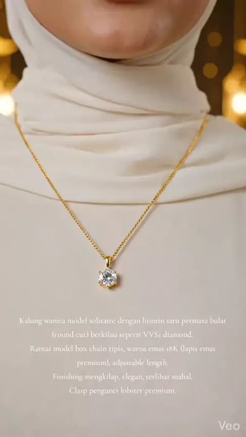 Kalung wanita model solitaire dengan liontin satu permata bulat (round cut) berkilau seperti VVS1 diamond. Rantai model box chain tipis, warna emas 18K (lapis emas premium), adjustable length. Finishing mengkilap, elegan, terlihat mahal. Clasp pengunci lobster premium. #CranberryJewelry #KalungWanita #KalungEmas18K #PerhiasanWanita #LuxuryJewelry