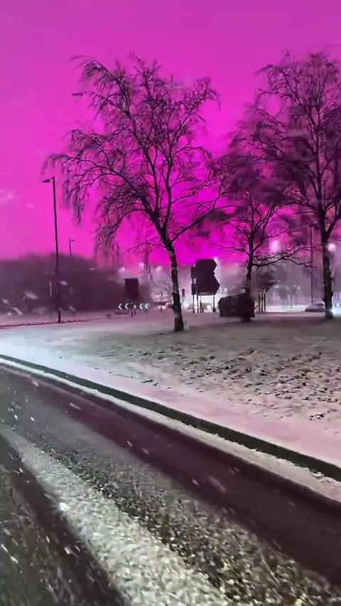 O céu rosa em Birmingham foi causado pelas luzes de cultivo do estádio do Birmingham City, refletindo na neve e nuvens durante a Storm Goretti.... alegadamente.