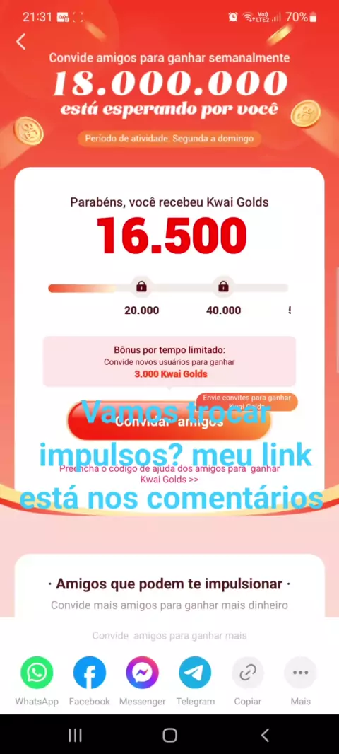 Ganhe 18.000.000 Kwai Golds semanalmente! De segunda a domingo, venha me impulsionar no Kwai todos os dias e ganharemos dinheiro juntos! https://kwai-video.com/w/9swosdY0
