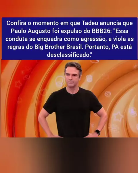 Confira o momento em que Tadeu anuncia que Paulo Augusto foi expulso do #BBB26: "Essa conduta se enquadra como agressão, e viola as regras do Big Brother Brasil. Portanto, PA está desclassificado." #realityshow #reality #bbb26