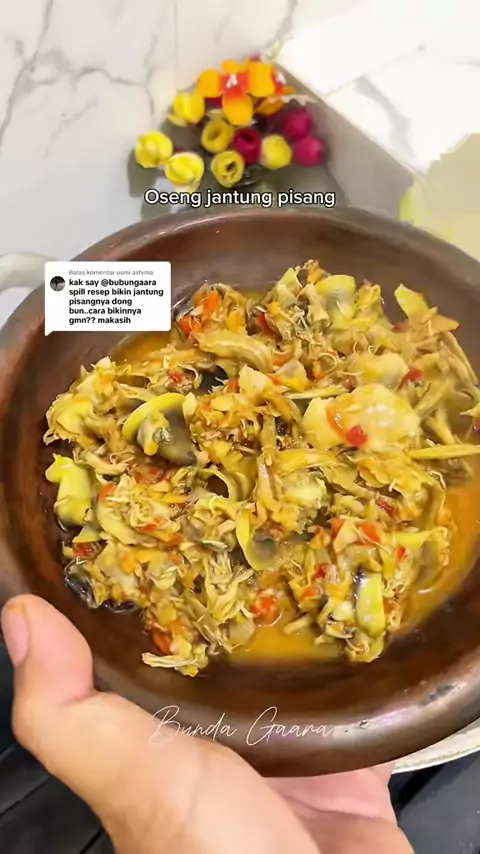 Membalas @usmi ashima jangan lupa direcook dan masak nasi yang banyak ☺️ Bumbunya simple cabe, bamer,baput aja udah. gula jawa nya agak banyakin, trus oseng bumbunya sampe bner2 mateng. seriuss ini enaakkkkk bgt bgt!#osengjantungpisang#masakanrumahan#menusederhana#bundagaara