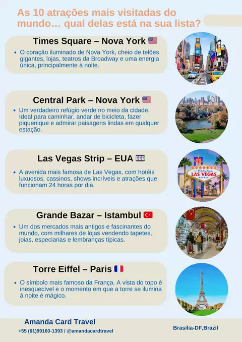 ✈️🌴 Férias chegando! Já planejou a sua? Que tal viajar sem preocupações e com serviço exclusivo Amanda Card Travel? 😍 🛏️ Pacotes com Aéreo + Hotel com café da manhã a partir de R$2.500 📋 Roteiro personalizado feito especialmente para você ✨ Atendimento VIP para transformar sua viagem em uma experiência inesquecível Não perca tempo! Garanta sua viagem dos sonhos agora mesmo. 📲 Entre em contato: WhatsApp: 61 99160-1393 E-mail: amandacardtravel@hotmail.com Redes: @amandacardtravel (YouTube