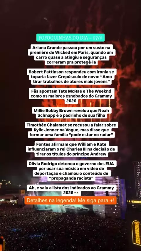 As fofocas do dia estão fervendo Durante a première de Wicked em Paris, Ariana Grande viveu um susto ao quase ser atingida por um carro. Seguranças agiram rapidamente para protegê-la, e o vídeo viralizou nas redes Robert Pattinson respondeu com ironia quando perguntado se toparia fazer Crepúsculo novamente: “Amo tirar trabalhos de atores mais jovens” Nas redes, fãs declararam Tate McRae e The Weeknd como os grandes injustiçados do Grammy 2026, após a divulgação da lista oficial de indicados Mil...
