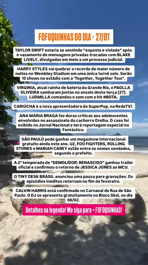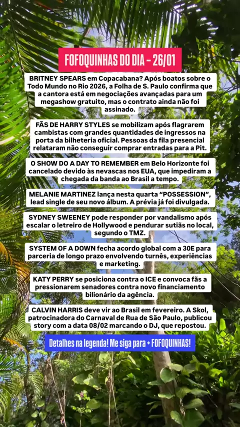 FOFOQUINHAS DO DIA BRITNEY SPEARS pode estar negociando um retorno histórico aos palcos no Brasil. Após a jornalista Fabia Oliveira afirmar que a cantora estaria confirmada no Todo Mundo no Rio 2026, o time do evento negou a informação. No entanto, a Folha de S. Paulo confirmou que Britney está em negociações avançadas para um megashow gratuito em Copacabana, embora o contrato ainda não tenha sido assinado. FÃS DE HARRY STYLES estão se mobilizando nas redes sociais após relatos de cambistas com...