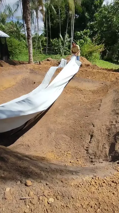 Continuação do revestimento da lona nesse tanque cavado totalmente no Dividimos a lona ao meio e fizemos a colagem. O tanque já está quase cheio de água