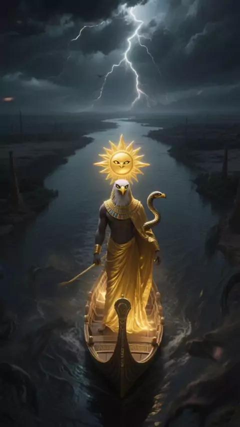 🌌 El Viaje Nocturno de Ra por el Inframundo | Mitología Egipcia Narrada Cada noche, el dios solar Ra emprende un viaje peligroso a través del Inframundo. 🌑 Allí enfrenta a monstruos, atraviesa ríos de oscuridad y lucha contra la serpiente Apofis 🐍, que intenta devorar el sol para sumir al mundo en el caos eterno. #MitologíaEgipcia #Ra #ViajeNocturno #Apofis #Inframundo