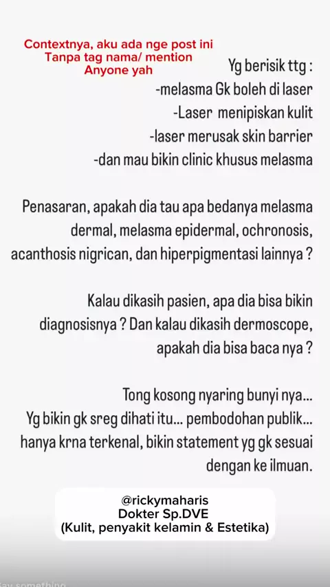 Sebagai spesialis kulit, agak kurang sreg yah, spesialis lain mengkomentari terapi dan tatalaksana para spesialis kulit yang sudah sesuai dengan jurnal, buku dan keilmiuan. Saya mengeluarkan video ini sesuai dengan kompetensi saya saja. Jadi masyarakat juga tau, perspektif seorang dr kulit mengenai kasus kulit (melasma) bagaimana.#melasma#melasmatreatment#laser#picolaser#peeling