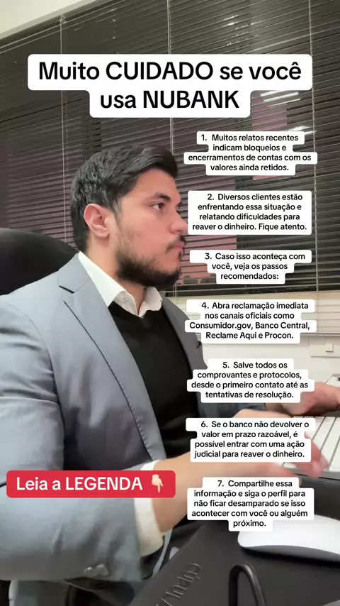 Tenho recebido muitos relatos de pessoas com a conta bloqueada e dinheiro retido dentro do banco, principalmente no Nubank. Se isso acontecer com você, não aceite calado. Guarde todos os registros, faça reclamação formal nos canais oficiais e, se não resolverem, é possível acionar a Justiça. Falo mais sobre isso aqui no perfil. #direitobancario #advogado #nubank #contabloqueada #bloqueiobancario