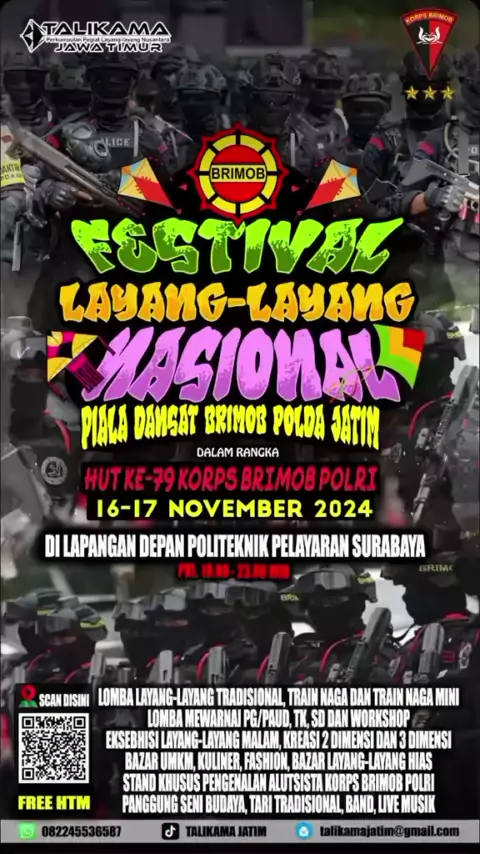 Yuk bolo surabaya merapat. Agenda akhir taun. Festival Layangan Nasional piala Brimob Hut ke 79 Brimob #festival #festivallayangan #kitefest #brimob #layangan #surabaya #pialabrimob #hut79brimob