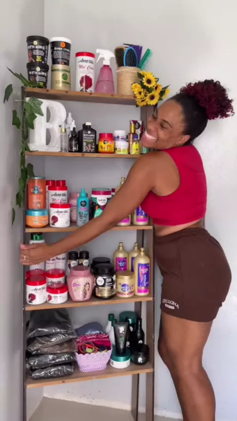 ✨ Estante escada que tanto vcs me perguntam 🤭 Medidas: altura 1.78 Largura: 0,56 Profundidade: prateleira 1 e 2: 0,20 prateleira 3: 0,24 prateleira 4: 0,28 prateleira 5: 0,32 • #cachos #crespas #cacheadas #produtodecabelo #estanteescada