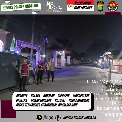 Anggota Polsek Babelan dipimpin Perwira Pengendali Akp Hari Purwoko Melaksanakan Patroli Harkamtibmas cegah terjadinya Guantibmas, curas, curat, Curanmor, Tawuran serta Kejahatan Lainya di Jalan Perjuangan, Kelurahan Kebalen, Kecamatan Babelan Kabupaten Bekasi. Selasa (24/02/2026) Source : @Divhumaspolri @HumasMetroBks @Kapolres_Bekkab @Poldametrojaya_ #divisihumaspolri #kapoldametrojaya #humas.poldametrojaya #humaspolresmetrobekasi #kapolres.bekasikabupaten .polri