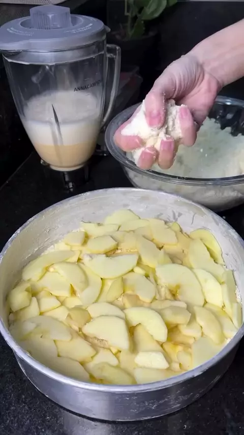Cuca de Maçã Farofa: 2 xícaras de farinha de trigo 1 xícara de amido de milho 2 xícaras de açúcar 1 colher (sopa) de fermento em pó 1 xícara de margarina ou manteiga Liquidificador: 3 ovos 1 xícara de leite 4/5 maçãs cortadas em meia lua Canela em pó (opcional) Minha forma tem 26 cm. Caso faça em uma forma maior, a farofa fica mais por cima, pois o líquido não cobre tanto. Fica uma delícia também, só cuidado para não exagerar e usar uma forma muuuito grande. Créditos @annacampiolo #vir