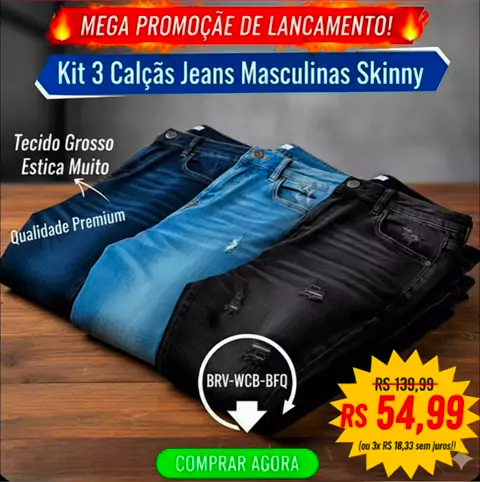 #blackfridaykwai #AFazenda17 #visualizar #VozPretaEcoa #2025internationalshortvideocompetition Crie um anuncio de kit 3 calça jeans masculina Skinny tecido grosso estica muito qualidade premium.