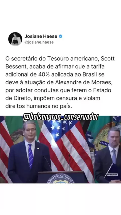 🚨🇧🇷 **ALERTA MÁXIMO!** O Secretário do Tesouro dos EUA, Scott Bessent, confirmou: **40% das tarifas de 50% sobre o Brasil** são consequência direta das ações do **sancionado Alexandre de Moraes**. O culpado está claro: **Moraes causou quase metade do prejuízo econômico** do país com suas decisões autoritárias. Enquanto isso, **mídia, parlamentares e influentes se calam**, fingem neutralidade e **se tornam cúmplices do desastre nacional**. #BrasilEmCrise #MoraesResponsável #CensuraNão #Liber