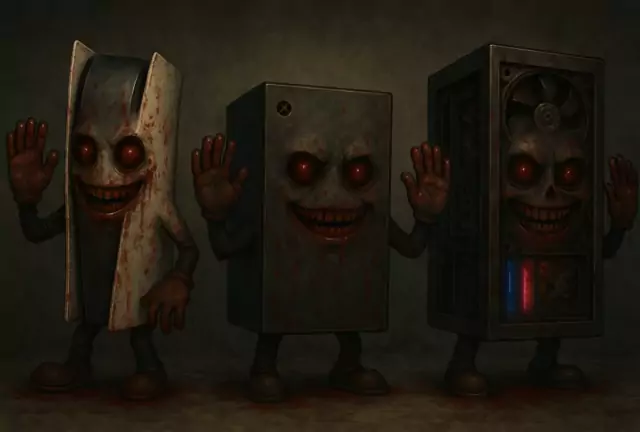 Descrição: Três monstros gamers — um PS5, um Xbox Series X e um PC gamer RGB — tomam forma nesta ilustração sombria e brutal. Com olhos vermelhos, sorrisos macabros e sangue escorrendo pelo corpo, eles estão prontos para dominar o cenário gamer com estilo sinistro. Perfeitos para quem curte o lado dark da tecnologia e adora misturar terror com humor criativo. Tags: #PS5Horror #XboxMacabro #PCGamerDark #SetupAssombrado #GamersSinistros