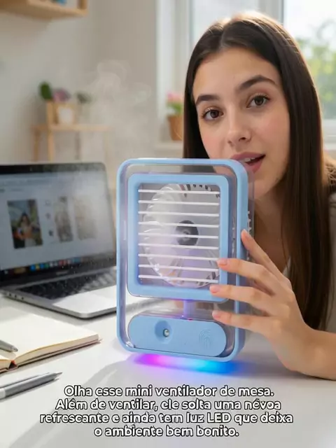Mais conforto e frescor para o seu dia! 🌬️✨ Esse mini ventilador portátil de mesa combina ventilação, umidificador com nanospray e luz LED decorativa em um único aparelho. Compacto, silencioso e recarregável por USB, é perfeito para usar no quarto, escritório ou estudos. #maisviews #KwaiShop #promoçao