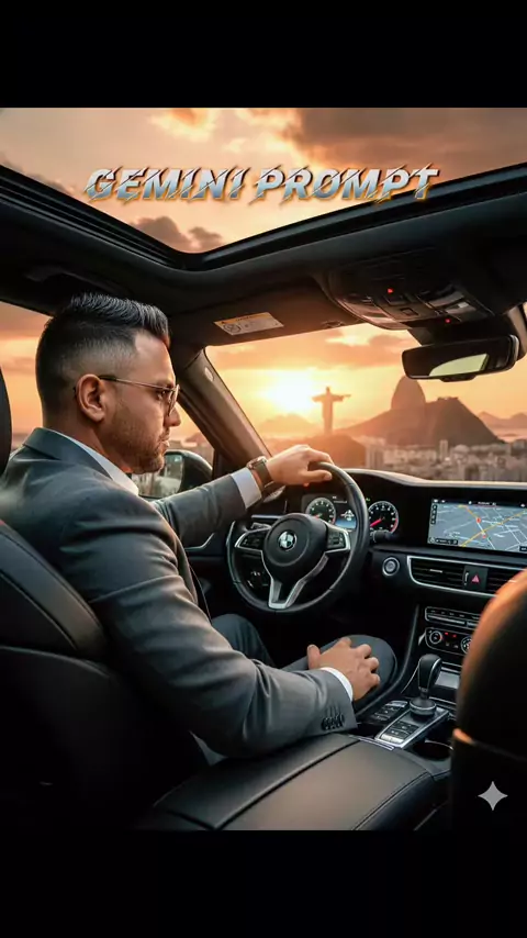 Create an ultra-realistic 8K image of a Brazilian man in his early 30s, preserving 100% of the features from the reference photo (no facial alterations). Pose: seated in the driver's seat of a modern luxury car with a large panoramic sunroof. Details: robust and athletic build, short hair combed to the side, mustache and thin beard. Wearing a gray suit, white shirt without a tie, sunglasses, and a smartwatch on his left wrist. Interior: premium black leather seats, modern technological dashboard