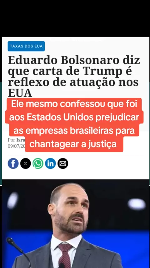 O deputado federal licenciado Eduardo Bolsonaro (PL-SP), apontado por opositores como um dos responsáveis por influenciar o governo dos Estados Unidos a impor uma tarifa de 50% sobre produtos brasileiros, afirmou que a decisão do presidente americano, Donald Trump, é uma resposta a "abusos" cometidos pelo Brasil, em alusão ao Judiciário e ao “establishment” político. Ele admitiu conversas com o governo trumpista para punir autoridades brasileiras e afirmou que a solução seria uma "anistia geral