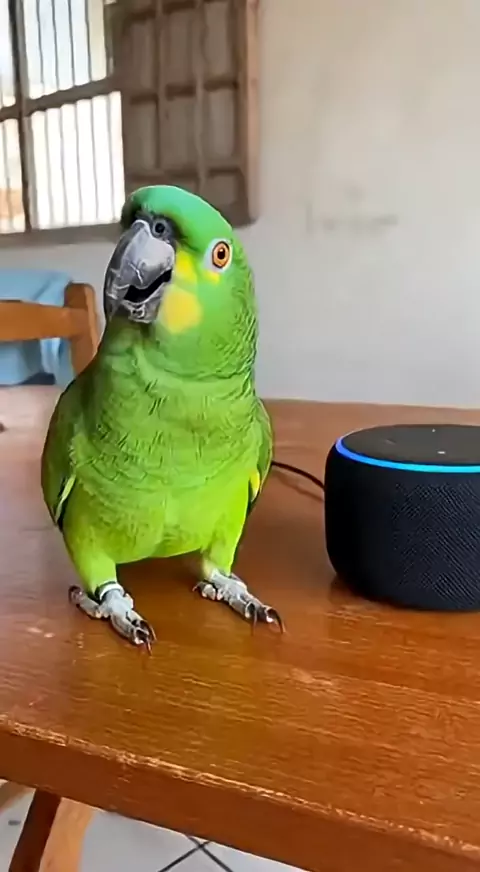 papagaio pedindo alexa a música pra dançar