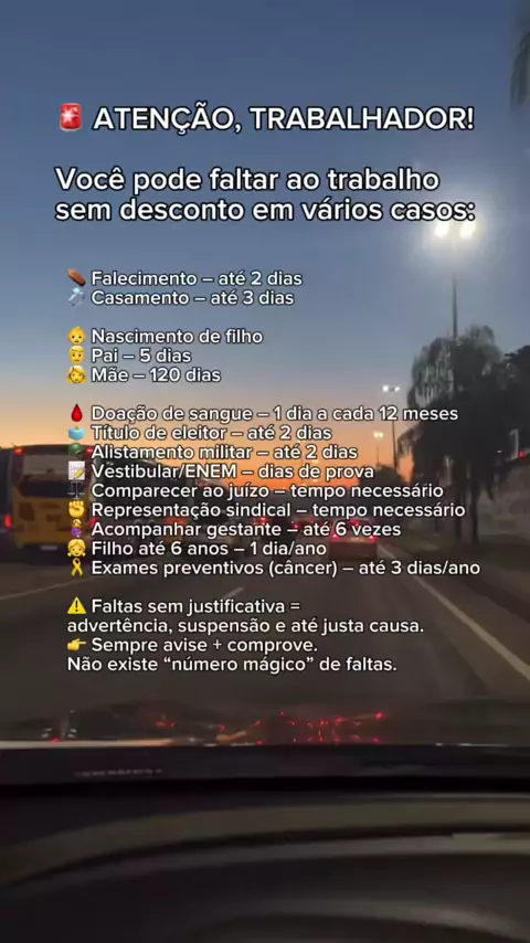 🚨 Você sabia que pode faltar ao trabalho SEM desconto? A CLT garante várias situações em que o trabalhador pode se ausentar legalmente, sem perder salário 👇 Casamento, luto, nascimento de filho, doação de sangue, consultas médicas, ENEM, título de eleitor, audiências, exames preventivos… tudo isso é direito seu! ⚠️ Mas atenção: faltas sem justificativa podem gerar advertência, suspensão e até demissão por justa causa. E não existe número mágico de faltas permitidas. 📌 Sempre avise a empre