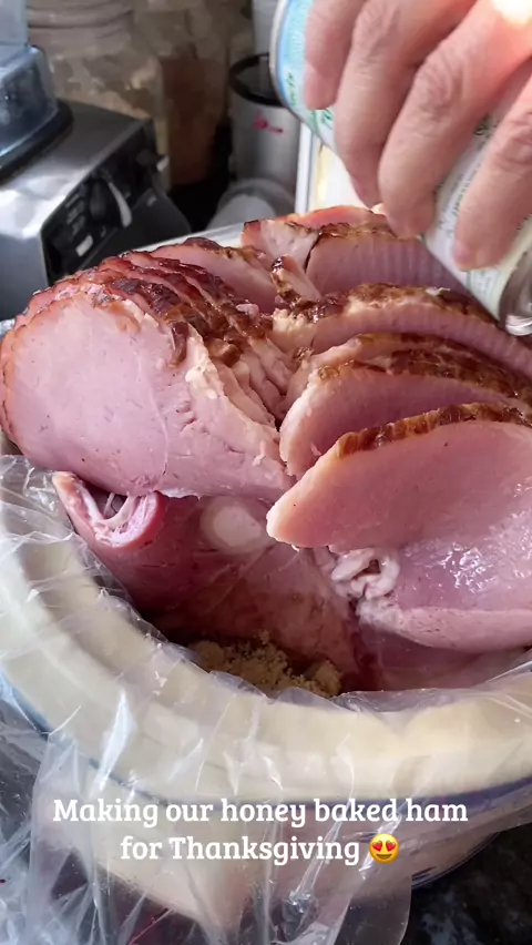 Homemade honey baked ham Step 1: buy a ham Step 2: coat bottom of slow cooker with brown sugar. Step 3: put ham on top, Step 4: pour pineapple, honey and more brown sugar on top. Step 5: Cover and let it cook for 6 hours #Food #Kwai #honeybakedham