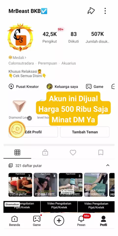 Akun ini dijual, harga 500 ribu, Jika tertarik DM, Bonus akun @Calon Sutradara(O150001627460341) #SnackTalent