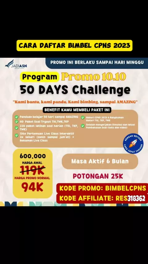 CARA BIMBEL CPNS 2023 Silahkan gunakan Kode diskon tambahan BIMBELCPNS dan Kode afiliate RES318362 Tata cara pendaftaran bimbel di jadipppk dan mendapatkan diskon harga !! Berikut caranya !! 1. Download Aplikasi jadiasn di playstore atau appstore  2. Login di aplikasi jadiasn atau di web app jadiasn id 3. Ke menu pembelian > KLIK Beli paket yang kamu pilih (Mohon baca pilihan paketnya dengan teliti yaa) 4. Baca tata cara pembayaran dan masukkan  Kode diskon tambahan BIMBELCPNS dan  Kode Diskon ...