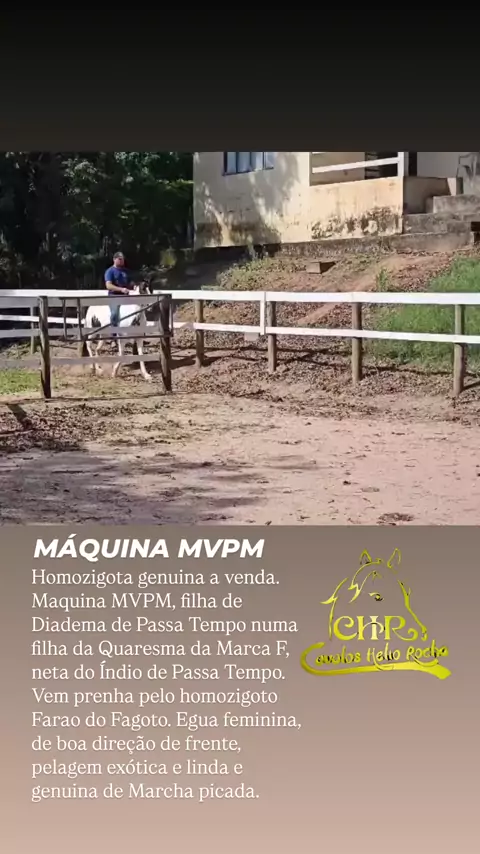 MÁQUINA MVPM Homozigota genuina a venda. Maquina MVPM, filha de Diadema de Passa Tempo numa filha da Quaresma da Marca F, neta do Índio de Passa Tempo. Vem prenha pelo homozigoto Farao do Fagoto. Egua feminina, de boa direção de frente, pelagem exótica e linda e genuina de Marcha picada.