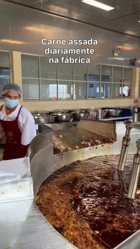 Produzida na fábrica, a carne bovina refogada é cozida em uma panela com mais de 100 jin.