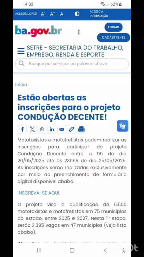 Saiba tudo sobre o Projeto Condução Decente 10/05/2025 Tudo o que você precisa saber sobre o CONDUÇÃO DECENTE O que é: projeto de promoção do trabalho decente voltado à qualificação de 6.500 mototaxistas e motofretistas em 75 municípios, entre 2025 e 2027. Na 1ª etapa, serão 2.395 vagas em 47 municípios. Inscrições: a partir desta terça-feira, 20, até 25 de maio para os 47 municípios da 1ª etapa. As inscrições pelo site da Setre (ba.gov.br/trabalho), por meio de formulário na página do proje