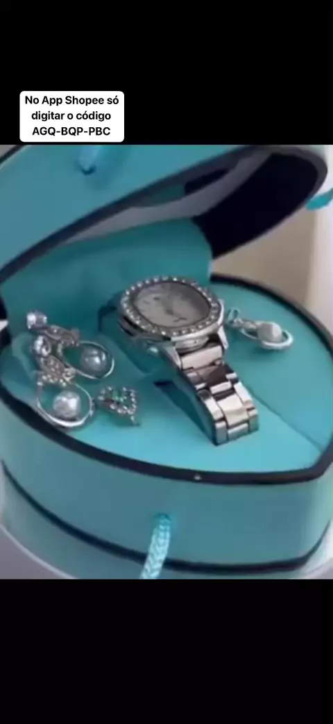 Kit Relógio feminino e Joias Dourado Caixa Coração Azul #relogio #relogiofeminino