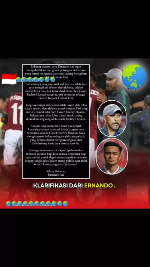 Kiper Timnas Indonesia 🇮🇩 Ernando Ari Sutaryadi memberikan klarifikasi melalui story akun pribadinya terkait ucapannya yang mengaku kalah bersaing dengan "PEMAIN TITIPAN" ketika melakukan seleksi untuk Timnas U-16 yang saat itu dilatih oleh Fakhri Husaini. Melalui klarifikasinya, Ernando mengaku tempat dia melakukan seleksi saat itu tidak dilakukan oleh coach Fakhri Husaini.#fakhrihusaini#ernandoarisutaryadi#timnasindonesia