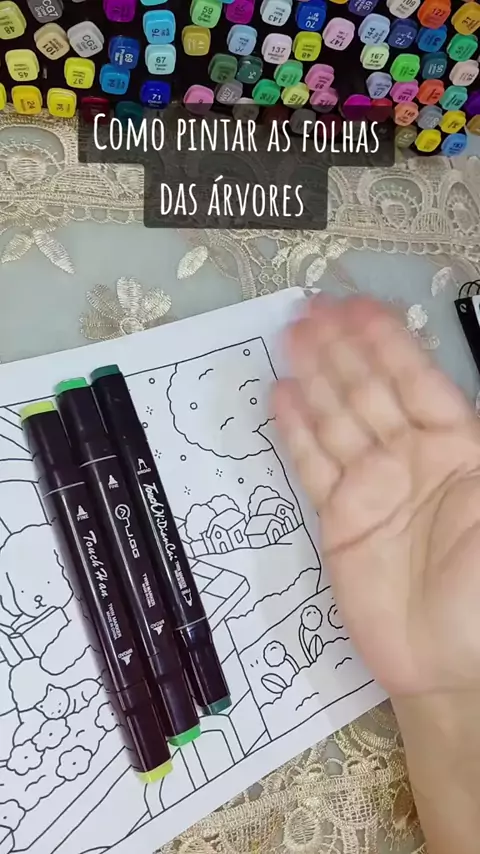 Jeito simples de pintar as folhas das árvores 🌳 (ps: ainda não tenho organizadores, então as canetas estão um caos kkk) #pintura #bobbiegoods #touch #colortok #coloring