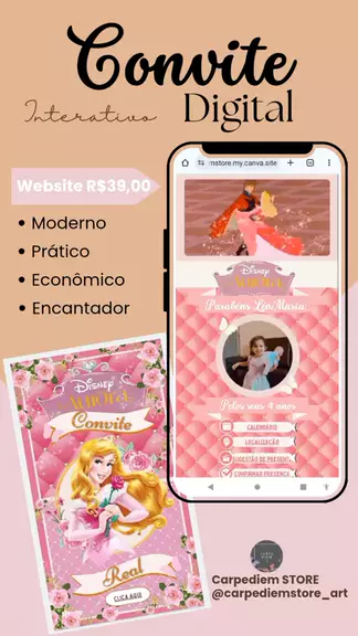 Convite Personalizado Interativo WebSite p/celular Princesas da Disney. Com botões clicáveis. Surpreenda com estilo! Vem comemorar esse dia tão especial com a Carpediem Store. Conheça nossos Convites Digitais. Eles farão toda a diferença na hora de convidar seus amigos e familiares para a festa de aniversário do seu filho(a). Um Jeito Especial de Compartilhar Essa Alegria! #conviteanimado #convitedigital #conviteinterativo #websitedesign #princesasdisney