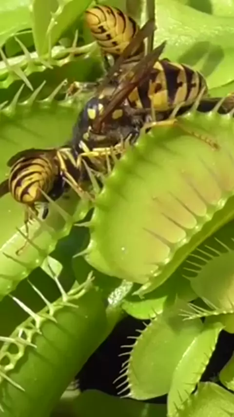 A planta carnívoros dionéia pega vespas. O dionéia é um carnívoros armadilhas de plantas e geralmente come pequenos insectos, mas aqui podemos pegar algumas vespas bonitas. O gotejamento néctar dionéia nas bordas da folha de isca, e captura os insetos que vêm para beber a partir dele. #noticias #bizarrasecuriosidades #estranho #incrível #fy