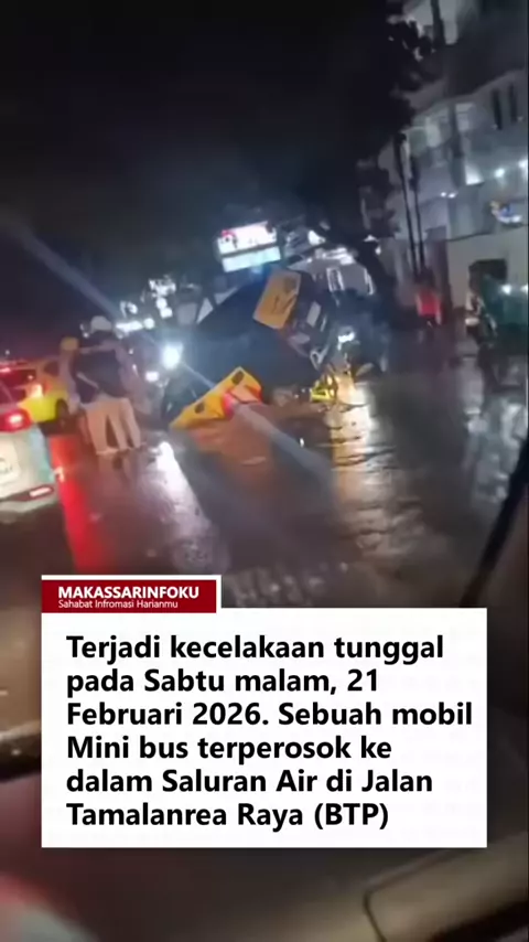 Terjadi kecelakaan tunggal pada Sabtu malam, 21 Februari 2026. Sebuah mobil Mini bus terperosok ke dalam Saluran Air di Jalan Tamalanrea Raya (BTP), Makassar tepat di depan Gerbang Perumahan Tamalanrea Mas. Netizen: Deh, besar memang tawwa di sini lubangnya kamase #makassarinfoku