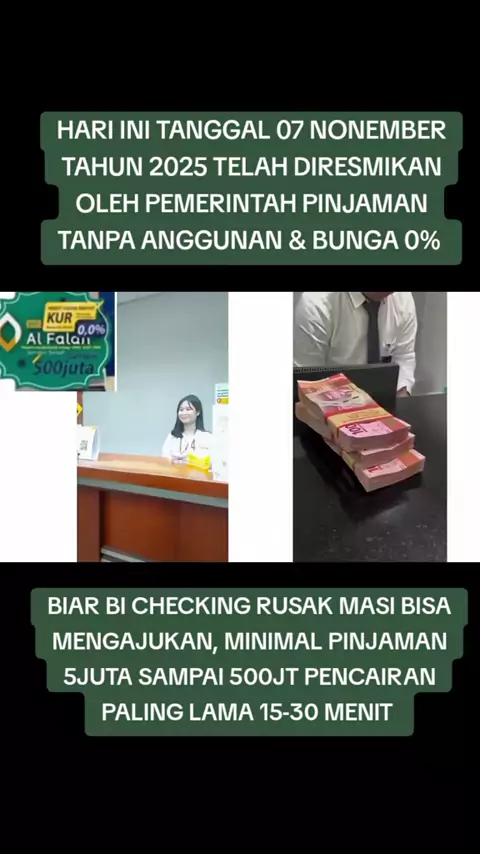 Sekarang telah diresmikan pemerintah mengadakan Pinjaman Online /cod yayasan BMT Al-Falah sejahterah, pinjaman aman dan amanah, bunga (0%) tanpa anggunan walaupun BI checking jelek bisa #bank #bri #pinjamanonline #4u #