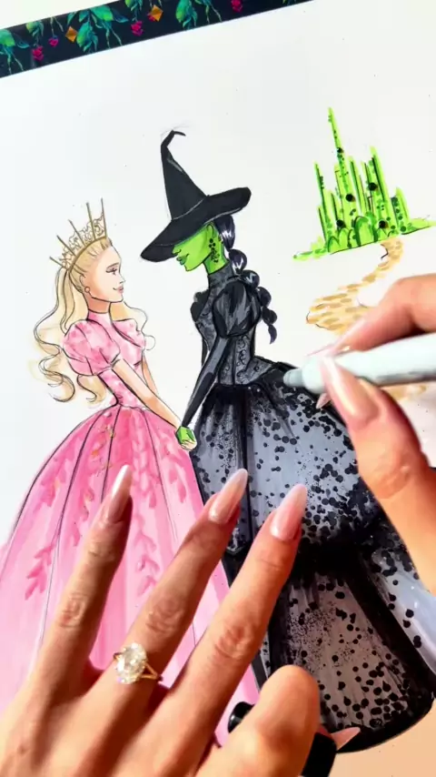 Um pouco de magia ✨ # asmr # fashionillustration # wicked # elphaba # glinda # copic # illustration # copicmarkers # relaxing # glitter