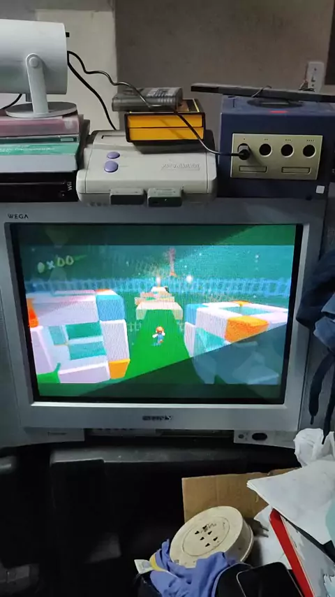 meu sobrinho jogando Mario Galaxy direto do Game Cube