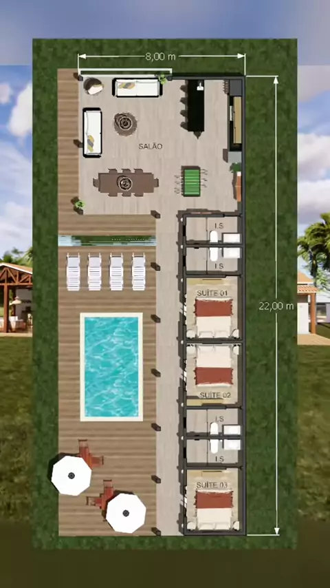 Projeto P058 - Edícula com 1 Quarto Este e vários outros projetos já disponível em nosso site. WWW.DSPROJETA.COM.BR #areagourmet #edicula #casadecampo #areadefesta #rancho@Daniele Souza Arq.