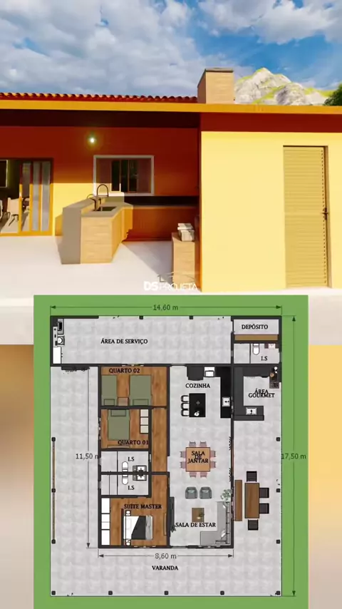 Edícula / Área gourmet - P060 Esse e diversos outros modelos de projetos PRONTOS, já disponível em nosso site. WWW.DSPROJETA.COM.BR #Casadecampo #edicula #casa2quartos #casaemL #chacara