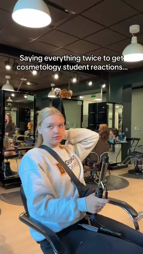 ✨ parte 3 ✨ repetindo tudo duas vezes... # pegadinhas # reação # repetindoeu # beautyschool # hairsalon # hairstylist # salon # cosmetologia # lucyseitz # marcel # curlinghair # cachos