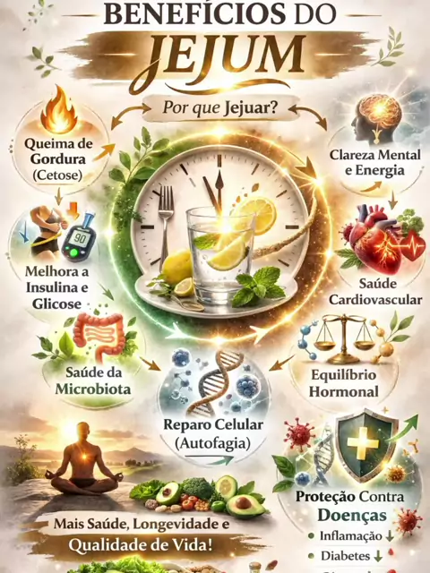 Comenta jejum para aprender mais! O jejum ativa mecanismos naturais de cura: melhora a sensibilidade à insulina, estimula a queima de gordura, reduz inflamação e promove autofagia — a “reciclagem” celular ligada à longevidade. Também pode favorecer clareza mental, equilíbrio hormonal e saúde metabólica quando feito com orientação adequada. #Jejum #Saúde #Longevidade